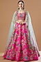 Featuring a fuchsia lehenga in raw silk base with applique embellishments. It is paired with a matching blouse and a contrasting dupatta having cutwork.