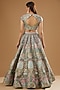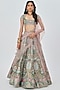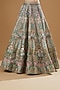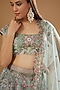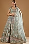 Featuring a gracious green lehenga in tissue base, an ideal and aesthetically designed choice for the contemporary Indian bride. This chic 16 kali lehenga set has exquisite applique work and stunning embellishments. It includes a matching blouse and a scalloped dupatta. The set is crafted with the finest materials and will accentuate your wedding, sangeet, or engagement look.