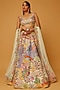 Featuring an ivory kali lehenga in kasab silk base with applique embellishment and print. It is paired with a matching blouse and a net dupatta.