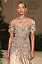 Aisha Rao presents a light gold gown in banarasi tissue brocade base with a plunging neckline, puffed sleeves and applique embellishments. Style this exquisite ensemble with a zircon dangler earrings and a statement necklace, Perfect for red carpet events, after-parties, destination weddings, and glamorous evening celebrations.