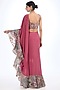 Featuring a magenta purple pre-stitched saree in mulberry crepe and organza base with ruffles detail and print. It is paired with an organza printed blouse. Accentuate it with statement earrings and heels for a cocktail party or engagement ceremony.