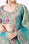 Featuring a medium turquoise lehenga in tissue base with mukaish applique embellishments. It is paired with a matching blouse and a dupatta.