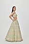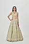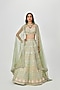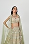 Featuring an elegant moss green lehenga in kasab satin base, an ideal and aesthetically designed choice for the contemporary Indian bride. This chic 16 kali lehenga set has intricate applique work and embellishments. It includes a matching blouse and a dupatta to complete the charismatic look. Perfect wear for a wedding or an engagement ceremony.