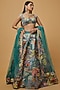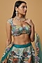 Featuring a mykonos green trencadis lehenga in kasab satin base with print and embellishments. It is paired with a matching blouse and a dupatta.