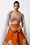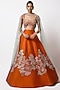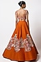 Featuring an orange lehenga in raw silk base with applique embellishment. It is paired with a blouse and a tulle net dupatta. Accentuate it with statement jewellery and heels for a wedding or sangeet ceremony.