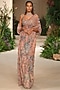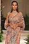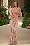 Featuring a peach saree in tulle and banarasi tissue brocade base with applique embellishments. It is paired with an embellished blouse. Accentuate with statement earrings, high heels and an embellished bag for a cocktail, sangeet or reception ceremony.