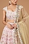 Featuring a pink lehenga in tissue base with mirror embellishments. It is paired with a blouse and a dupatta. Accentuate this statement lehenga set with heels and dangler earrings for a wedding or an engagement ceremony.