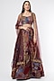 Featuring a plum lehenga in indian organza base with print and embellishment. It is paired with a matching blouse and a scalloped dupatta.