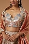Featuring a red kali lehenga in tissue base with applique embellishments. It is paired with a matching blouse and a dupatta having cutwork.