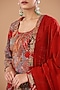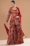 Featuring a red kurta in organza base with print and embellishments. It is paired with matching sharara pants and a chiffon dupatta.