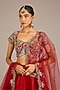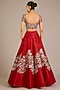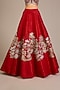 Featuring a red lehenga in raw silk base with applique embellishments. It is paired with a blouse and a tulle dupatta. Accentuate the designer lehenga with soft curls, kundan polki or swarovski jewellery, embellished heels and a potli bag for a traditional bridal look, Perfect wear for your royal weddings or engagement ceremony.