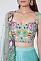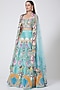 Featuring a scuba blue lehenga in raw silk base with print and applique hand embellishments on the kali. It is paired with a matching blouse and a net dupatta.