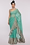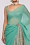 Featuring a sea green ruffled saree in organza base with print and embellishment. It is paired with a blouse. Accentuate it with dangler earrings or heels for weddings.