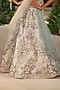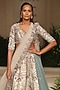 Aisha Rao presents a silver lehenga in banarasi tissue brocade base with applique embellishments. It is paired with an embellished blouse and a tulle dupatta. Style this exquisite ensemble with an emerald dangler earrings, a statement necklace and a seek bun, Perfect for destination weddings, saneegt or engagememnt ceremonies.