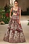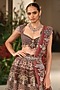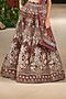 Aisha Rao presents a teakberry lehenga in tulle base with applique embellishments. It is paired with a checkered embellished blouse and a dupatta. Style this exquisite ensemble with an emerald dangler earrings, a statement necklace and a seek bun, Perfect for destination weddings, saneegt or engagememnt ceremonies.