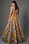 Featuring a yellow lehenga in tissue base with trencadis embellishment. It is paired with a matching blouse and a contrasting dupatta. Perfect wear for a bridal look.