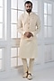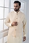 Featuring a beige nehru jacket in silk brocade base with hand and machine embroidery. It is paired with a kurta and pants. Style it with a mojaris for a festive occasion, wedding or engagement ceremony.