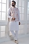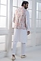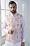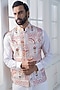 Featuring a multi-colored nehru jacket in cotton satin base with sequins hand and machine embroidery. It is paired with a kurta and pants. Style it with a mojaris for a festive occasion, wedding or engagement ceremony.