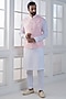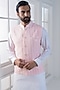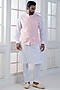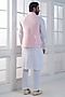 Featuring a pink nehru jacket in cotton satin base with sequins, hand and machine embroidery. It is paired with a kurta and pants. Style it with a mojaris for a festive occasion, wedding or engagement ceremony.