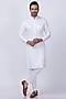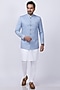 Featuring a powder blue bandhgala jacket in suiting base with zardosi embroidery. It is paired with a contrasting white embroidered kurta and pants.