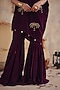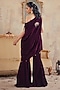 Featuring a deep wine one-shoulder tunic in velvet base with motif embroidery. It is paired with flared pants. Accentuate it with dangler earrings and heels for festive gatherings, poojas or evening soirees.