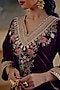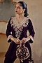 Featuring a deep wine short kurta in velvet base with mirror, gota, floral thread and motif hand embroidery, including a v-neckline. It is paired with sharara. Accentuate it with kundan polki earrings and heels for festive occasions, pooja or sangeet ceremony.