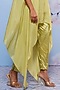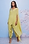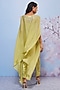 Featuring a mint asymmetrical cape in chiffon, cotton and satin lycra base with embroidery. It is paired with a bustier and pants.