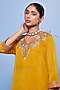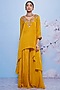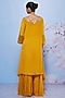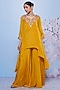 Featuring a mustard asymmetrical kurta in chiffon and cotton lycra base with embroidery. It is paired with a bustier and sharara pants.