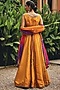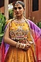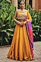 Featuring a mustard lehenga in silk blend and organza base with gota lines detail. It is paired with a blouse having thread motifs and mirror work, including a multi-colored embellished dupatta. Accentuate it with statement jewellery, a clutch and block heels for weddings or haldi ceremonies.