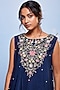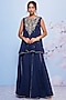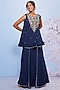 Featuring a navy blue short A-line kurta in chiffon and cotton lycra base with embroidery. It is paired with a bustier and sharara pants.
