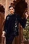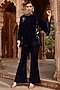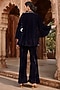Featuring a navy blue top in velvet base with knot detailing and embroidery. It is paired with matching flared pants.
