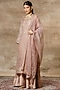 Featuring a nude sheer kurta in chanderi and organza base with resham, aari, badla, and cutdana embroidery. It is paired with matching sharara pants, bustier, and a dupatta.