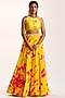 Featuring a yellow lehenga in georgette base with handmade tie-dye detailing and 3D floral waistband. It is paired with a matching raw silk blouse.