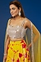 Featuring a yellow lehenga in velvet base with tie-dye. It is paired with a matching mirror and pearl embellished blouse and a net dupatta.