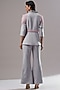 Featuring a grey peplum top in stretch crepe base with crystals hand embellishments. It is paired with matching ruffled pants.
