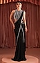 Featuring a black draped saree in satin base with an embroidered belt. It is paired with an embroidered blouse. Accentuate with statement jewellery and heels for a wedding or sangeet ceremony.