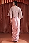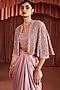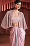 Featuring a blush rose cape in satin base with cutwork embroidery. It is paired with a blouse and a draped skirt. Accentuate it with statement earrings and heels for a festive look, sangeet or engagement ceremony.