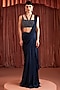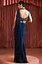 Featuring a midnight blue draped saree in satin base. It is paired with an embroidered blouse. Accentuate with statement jewellery and heels for a wedding or sangeet ceremony.