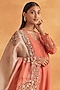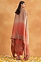 Featuring a peach kurta in silk base with embroidery. It is paired with matching silk pants and a satin organza embroidered ombre dupatta.