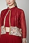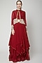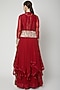 Featuring a maroon asymmetric lehenga in net base with thread and zardosi embroidery. It is paired with a matching chanderi crop top and organza jacket.