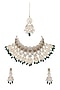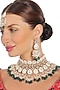 Featuring a gold finish green and white meenakari choker necklace studded with kundan, set in brass. It is paired with a matching pair of dangler earrings and a maang tikka. Perfect for weddings, engagements, celebrations, or special occasions, this choker set adds a touch of glamour and grace to your attire, making you the centre of attention.