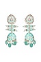 Featuring a pair of gold finish meenakari jhumka earrings studded with kundan polki including firozi and white beads, set in brass. Ideal for festive occasions or wedding celebrations.
