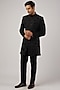 Featuring a black indo-western jacket in italian stretch base with machine embroidery. It is paired with pants. Perfect wear for a wedding or engagement ceremony.