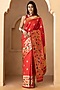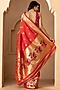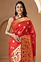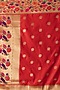 Featuring a deep red saree in pure katan silk base with woven banarasi zari motifs, floral and resham work. It is paired with a matching unstitched blouse piece.