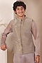 Featuring a grey nehru jacket for boys in tissue silk base with sequins work. It is paired with an organza silk kurta and pyjama. Style it with a watch and a classic pair of kolhapuris and a bracelet for a festive occasion or pooja ceremony.