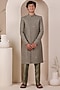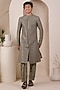 Featuring an olive green achkan for boys in knit tweed base with sequins embellishment. It is paired with chanderi silk pyjama. Style it with a watch and a classic pair of loafers and a bracelet for a wedding or mehendi ceremony.