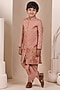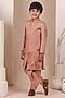 Featuring an onion pink achkan for boys in tissue silk base with floral motif embroidery. It is paired with chanderi silk pyjama. Style it with a watch and a classic pair of loafers and a bracelet for a wedding or sangeet ceremony.