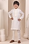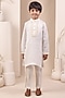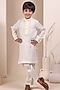 Featuring a white kurta for boys in soft linen base. It is paired with chanderi silk pyjama. Style it with a watch and a classic pair of loafers and a bracelet for festive occasions or sangeet ceremony.