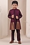 Featuring a wine jacket for boys in handloom moonga base. It is paired with a chanderi silk kurta and pyjama. Style it with a watch and a classic pair of mojaris and a bracelet for festive occasions or weddings functions.