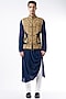 Featuring a black bundi jacket in raw silk base with zardosi hand embroidery. It is paired with a contrasting cotton silk kurta and pants.